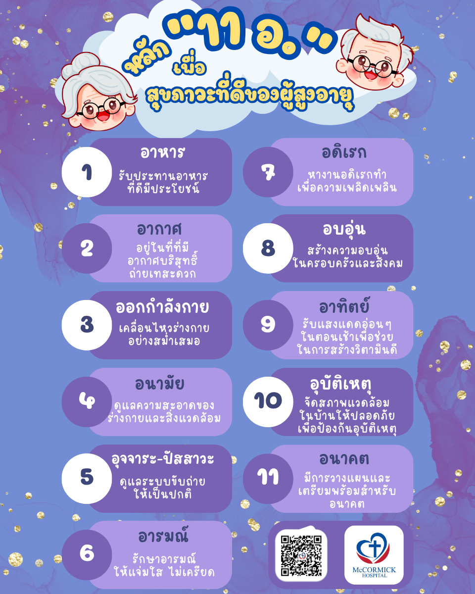 ในประเทศไทย มีการส่งเสริม "หลัก 11 อ." เพื่อเป็นแนวทางในการดูแลสุขภาพผู้สูงอายุอย่างครอบคลุม ดังนี้: