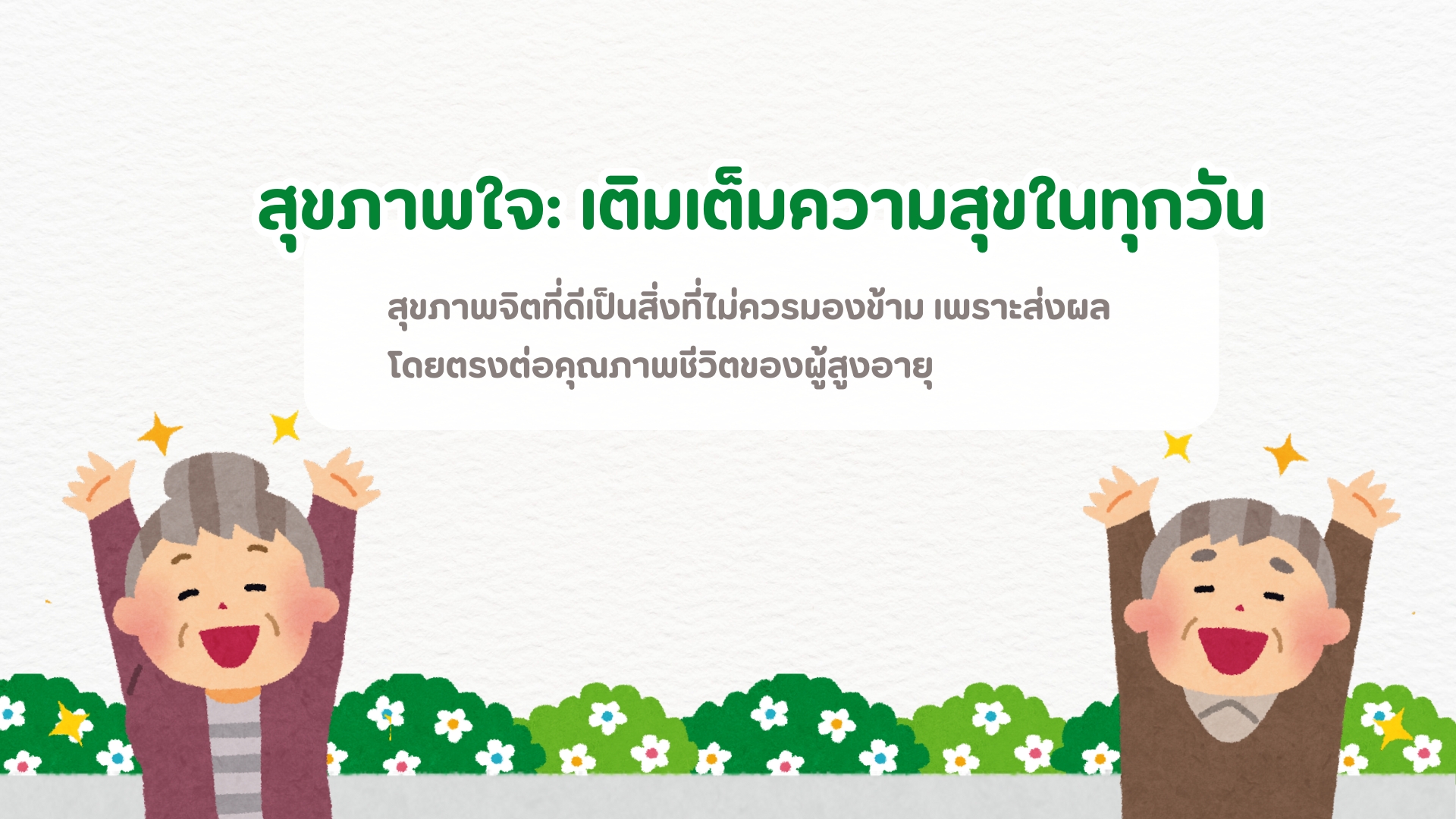 • เฝ้าระวังภาวะซึมเศร้า: หากผู้สูงอายุมีอาการเบื่อหน่าย ท้อแท้ แยกตัวจากสังคม หรือนอนไม่หลับเป็นเวลานาน ควรปรึกษาแพทย์เพื่อรับการวินิจฉัยและการดูแลที่เหมาะสม